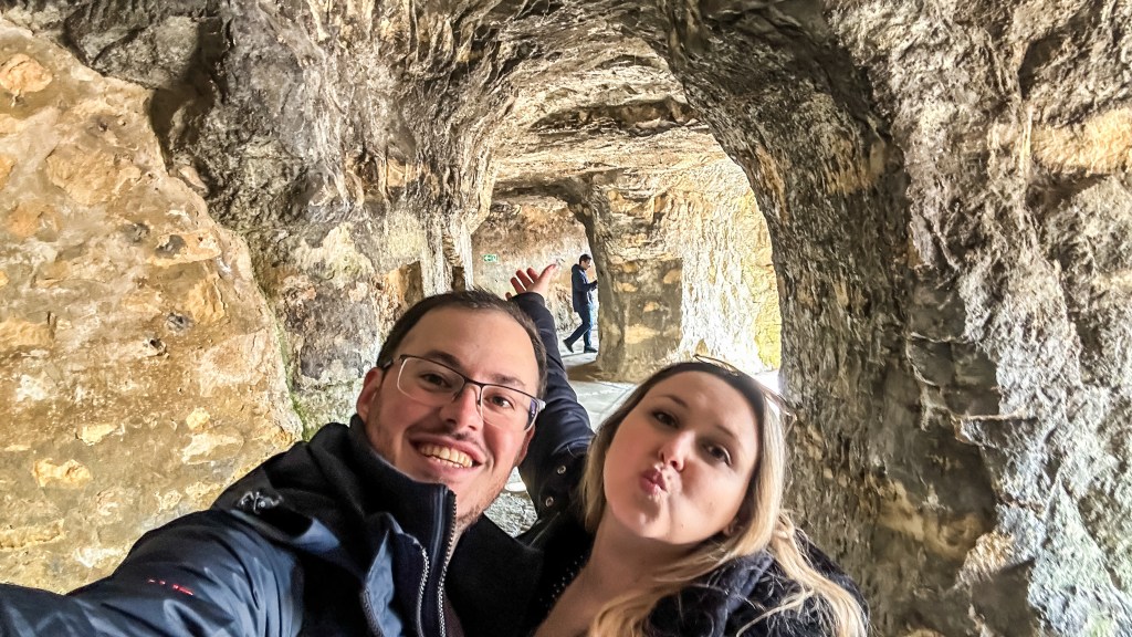 Depois do café, seguimos para um dos pontos mais impressionantes da cidade: as Casemates du Bock. São túneis subterrâneos construídos dentro das antigas muralhas da cidade, usados durante guerras para proteger soldados e civis. A sensação de caminhar ali dentro é surreal.