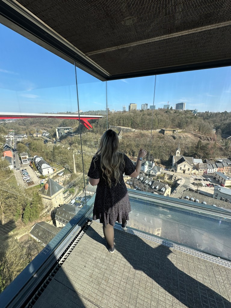 Saindo das casamatas, fomos conhecer o elevador panorâmico de Pfaffenthal, que conecta a cidade baixa à cidade alta de forma rápida e com uma vista sensacional! Lá de cima, dá pra ver o contraste entre o moderno e o histórico de Luxemburgo, além de tirar fotos incríveis.
